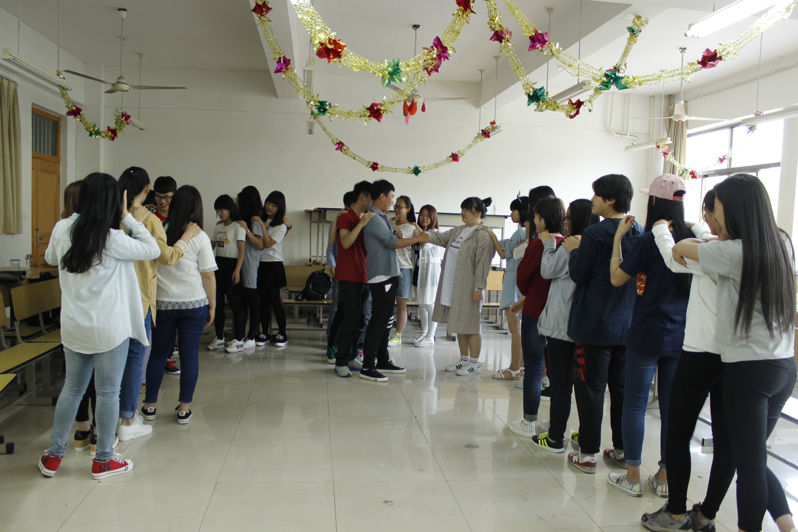 热身游戏,预热气氛 两人进行“石头剪刀布”,输的一方把双手搭在赢的人肩上,赢的一方继续找人pk,直到决出龙头和龙尾,之后全体人员模仿龙头的动作。预热之后,全体同学用报数的形式分成四个小组,每个小组经讨论产生一名组长与一名秘书,并一起决定组名与组歌,由此出现了如“小鲜肉”,“防弹少女团”等诙谐幽默的组名。在“齐眉棍”游戏中,每名组员都要伸出一根手指放在棍子下面,将棍子抬至眼眉处,在保证手指不能脱离棍子的前提下,小组成员齐心协力共同将棍子缓缓下移,移到膝盖以下位置。看似简单的游戏,却考验了团队协作能力和耐心、细致的心理品质,需要节奏一致、相互配合、不急不躁、指挥得当。在经过几次失败后,每个小组都摸清了游戏的特点和规律,配合得更加默契,他们互相鼓舞,喊着口号,统一节奏,齐心协力地完成了任务。