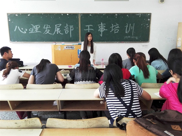 首先,由部长管芃向14级干事们介绍了心理发展部的主要职能,以及部门分工和各种特色活动。随后,由心理发展部的刘璇、矫佳成等三人分别就团体辅导、趣味运动会、策划写作和新闻写作等方面对14级干事展开培训。培训过程中,干事们在台下认真听讲,并努力做记录。到最后的提问环节,管芃针对大家提出的各种问题进行了解答,并对培训活动做了总结。