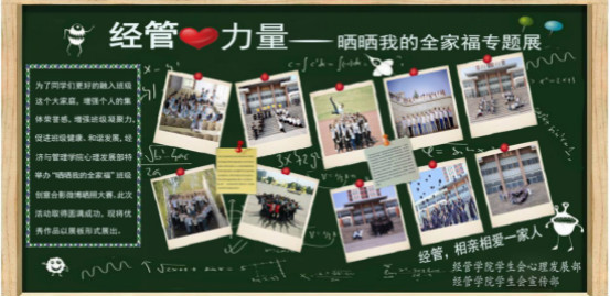 本期“经管❤力量”特色栏目以“晒晒我的全家福”为主题制作喷绘,展示了同学们用心准备的富有创意的班级合照,体现出各班级的团结向上、富有青春活力的班级精神。让同学们在欣赏各班级风采的同时,理解全家福的内涵,更好维护班级利益,增强集体荣誉感。![]()