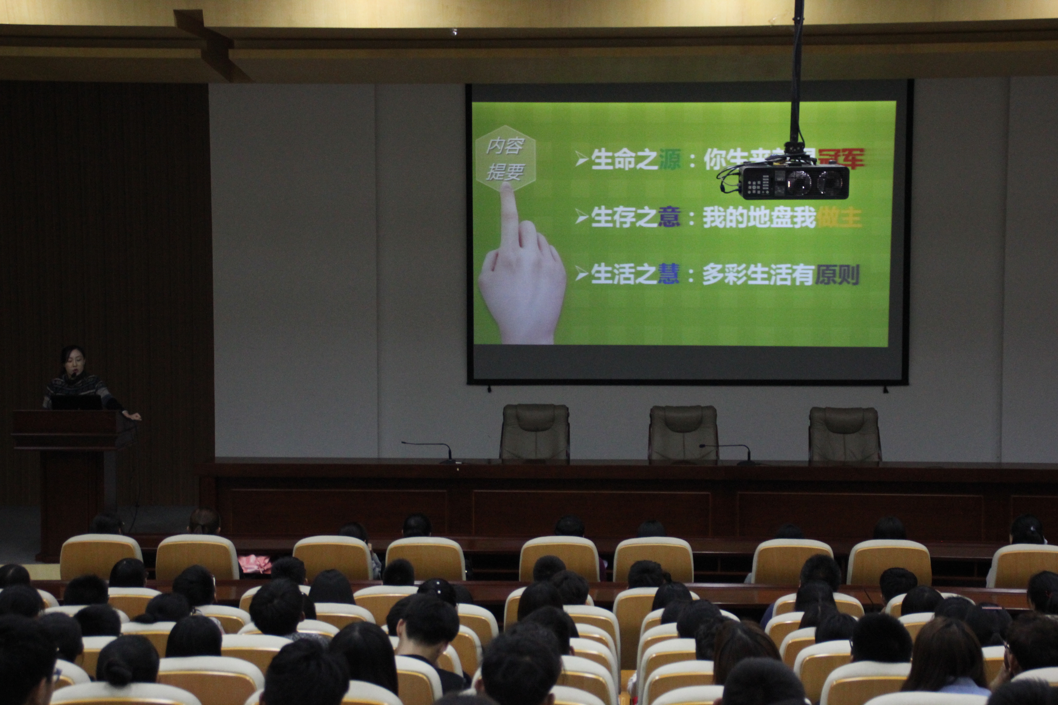 此次宣讲向2017级学生全面讲解了生命的意义与重要性,并就在大学生活中可能会遇到的系列心理问题做了分析与讲解,有利于2017级学生树立正确的人生观与价值观,确立实际且美好的理想,并引领他们以一个优良的心态向成功迈进。