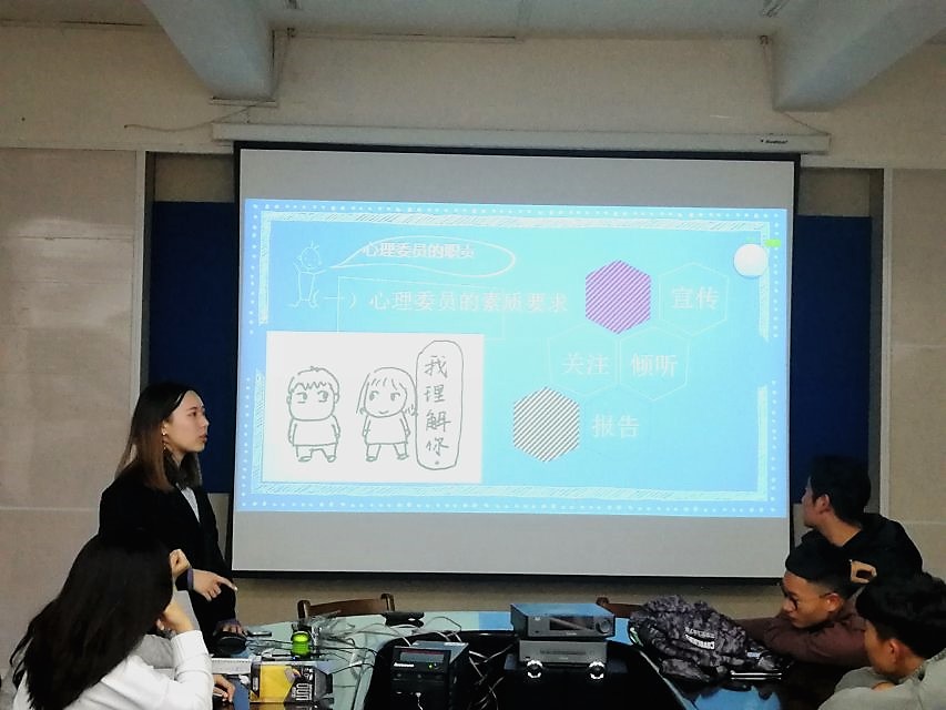 培训中,王晓依从心理委员的职责入手,为大家介绍了相关内容。她说道,“我们身上肩负着这个责任,我们更应该主动关注每个同学,观察同学们的微妙变化及时发现问题,及时进行交流。”随后,李萌为大家讲解了心理委员的日常工作以及一些常见的心理问题。其中,李萌着重强调了心理委员要本着认真负责的态度填写心理危机排查表。培训最后,罗珊珊补充了三点问题,一是大家一定要重视大学生心理问题,二是心理委员要做好心理危机排查表的保密工作,最后一点也是最重要的一点,班长与心理委员要善于观察同学情绪并及时给予帮助。